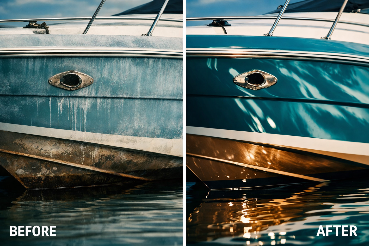 Hull surfaces take the worst abuse — waterline staining, algae, oxidation, fuel splash.