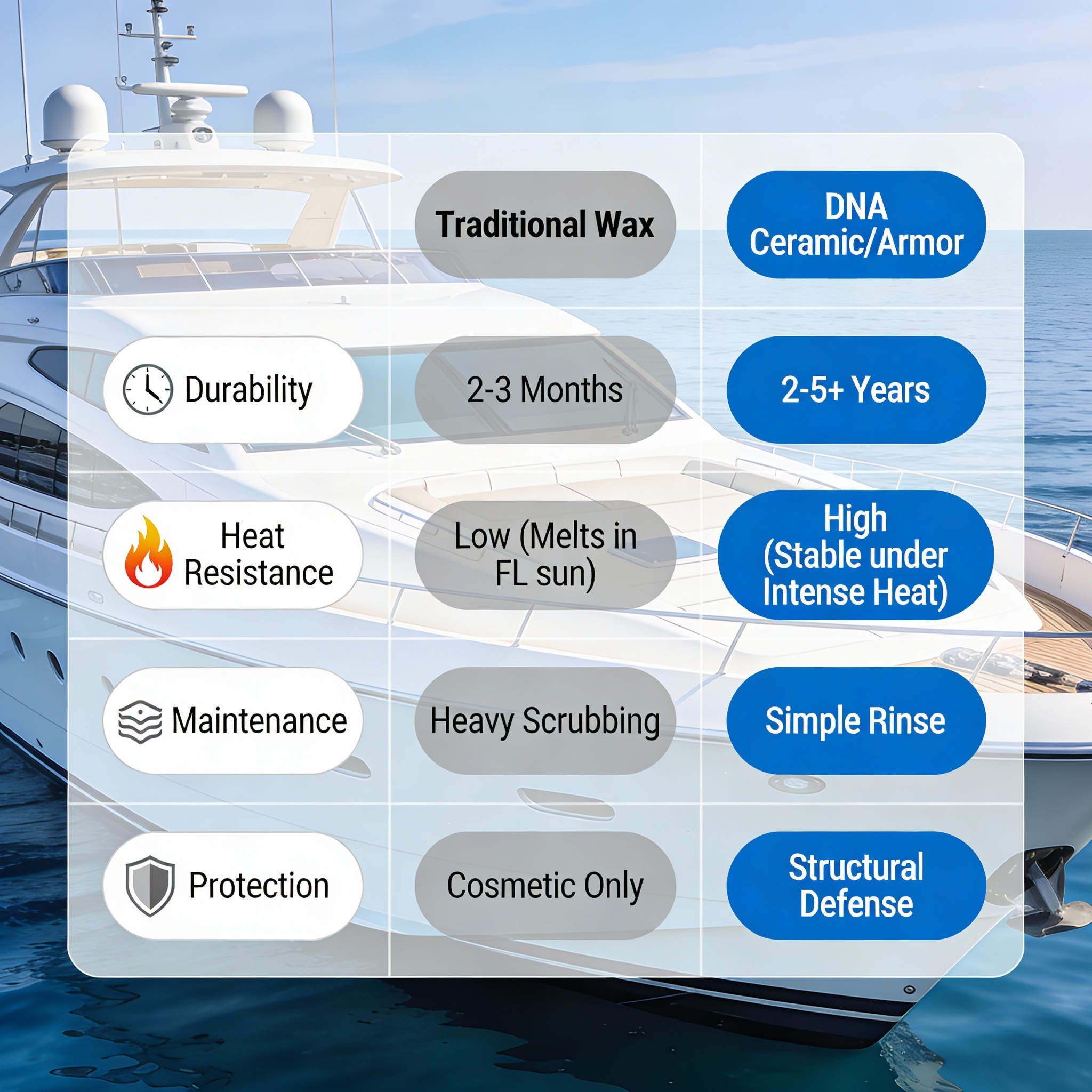 Wax does nothing for that. DNA Surface Concepts exists to stop surface degradation on your boat before it starts, keeping your boat looking exceptional for years to come, not just seasons.